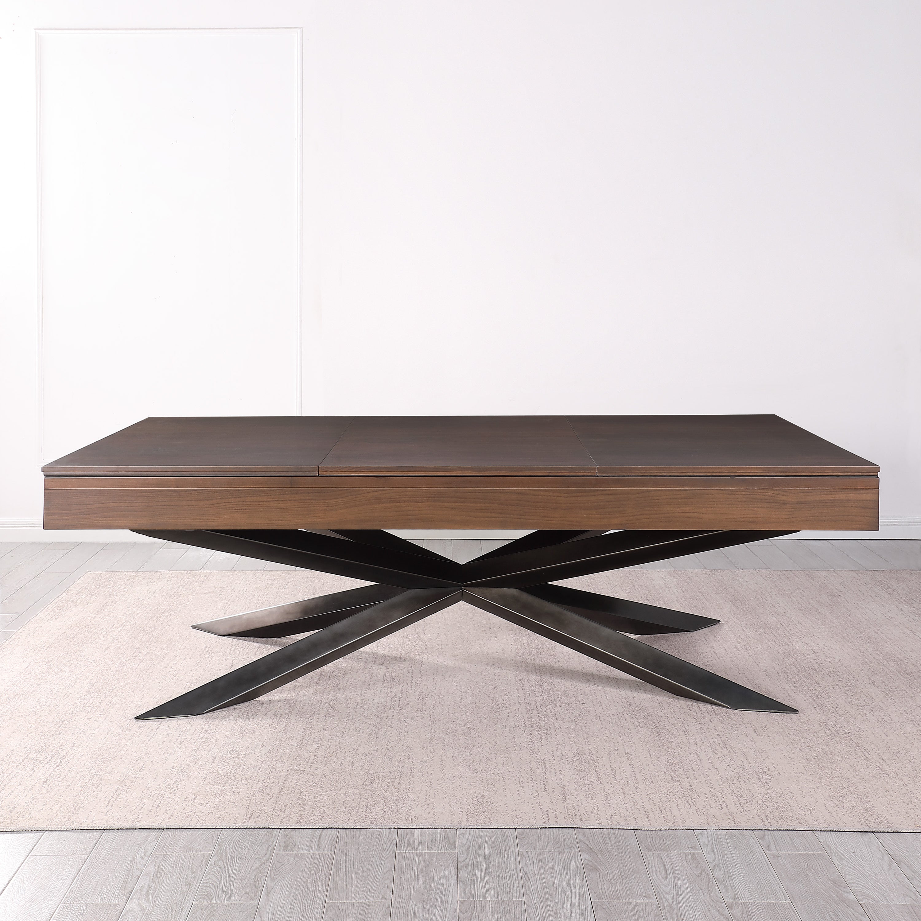 The Stella slate 8’ pool table is manufactured from premium solid hardwood and carefully crafted metal components. Finished in a natural stain, the walnut wood exterior has a rich and complex finish that is unique to that species. The unconventional star pattern leg design makes a massive statement in any room. The Stella’s sister table, the Astral, includes a steel inlayed apron band and is finished as natural Walnut. More than just beautiful furniture, quality materials and construction ensure that you will enjoy many years of high quality billiards with family and friends! The rails are appointed with inlaid sights and the premium K66 profile gum rubber cushions provide a superior, dependable rebound.