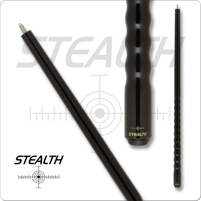 Black pool cue with 'Stealth' branding on a white background